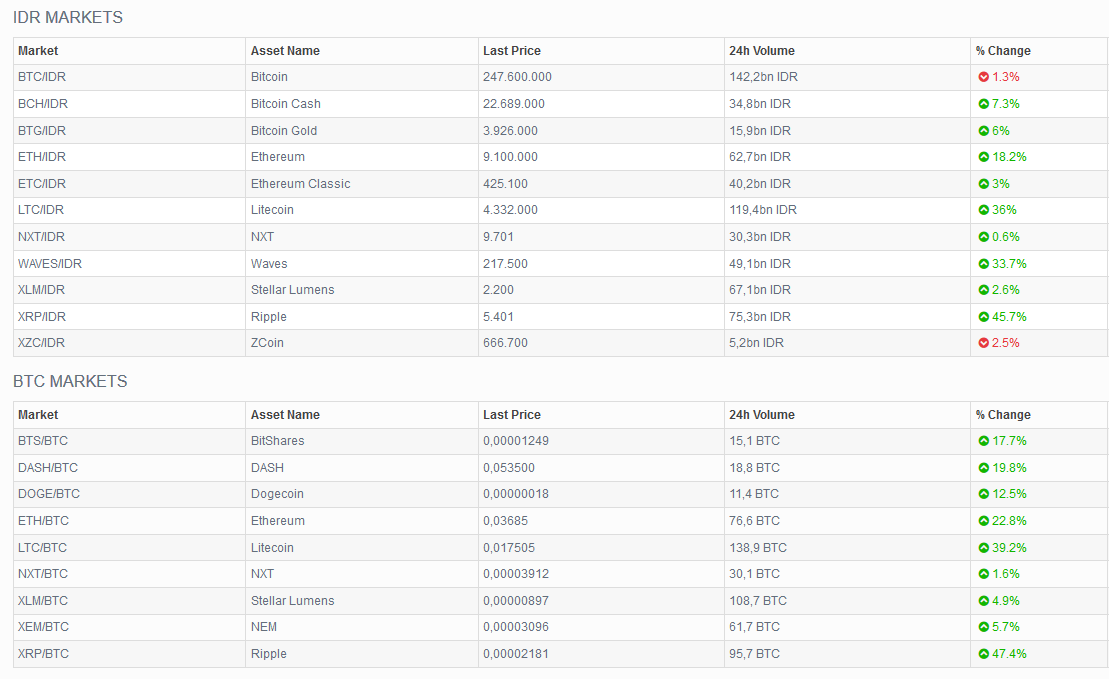 BITCOIN (BTC), ETHERIUM (ETH), ETHERIUM CLASIK (ETC), ZCOIN (XZC), RIPPLE (XRP), LITCOIN (LTC), WAVES (WAVE), LUMENS (XLM), BITCOIN GOLD (BTG) DAN NXTCOIN (NXT)